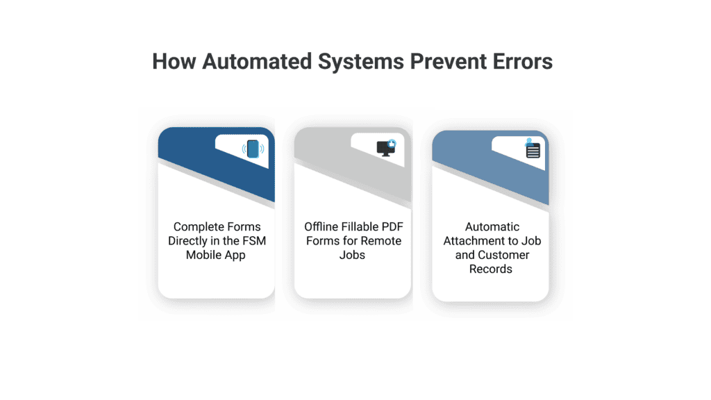 At the same time, fillable PDFs improve field accuracy by replacing handwritten entries with built-in validation. Mandatory fields prevent missing information, standardized date formats reduce errors, signature capture ensures approvals are complete, and checkbox confirmations verify safety steps or inspections were followed. This combination reduces rework, minimizes office follow-ups, and maintains consistent documentation quality without adding friction for technicians in the field.