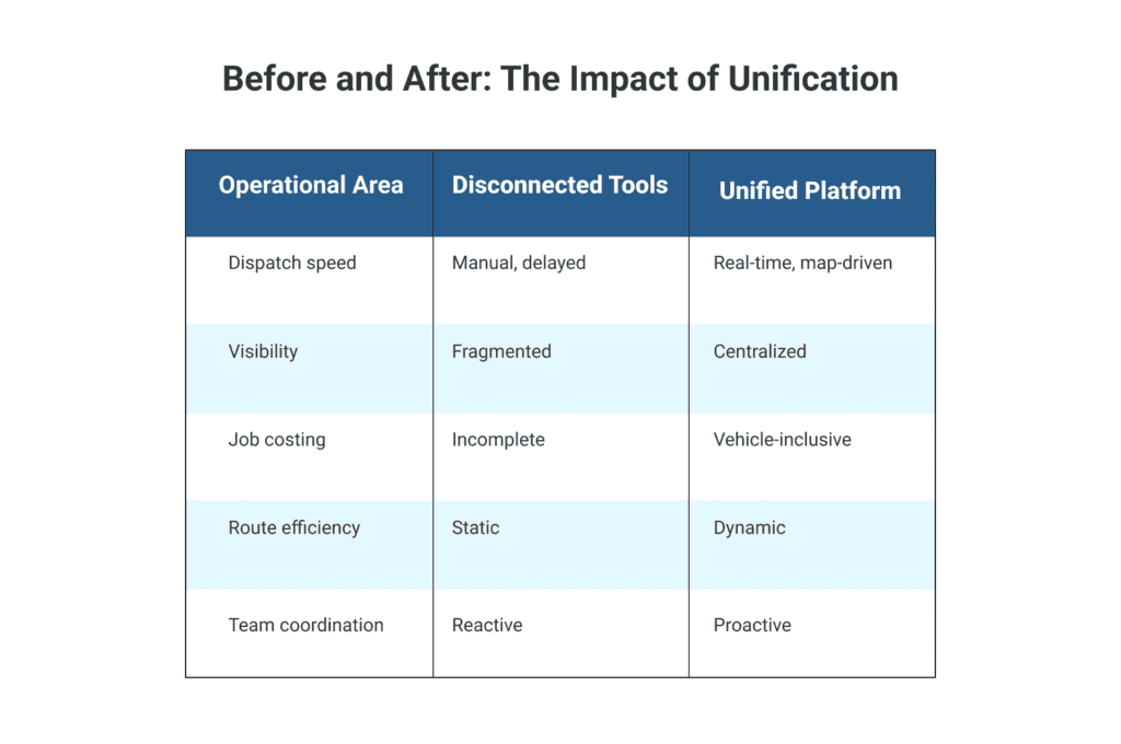 A unified platform replaces constant tab switching with a single source of truth. Dispatch, fleet, scheduling, and job status live together, improving focus and reducing error risk.
